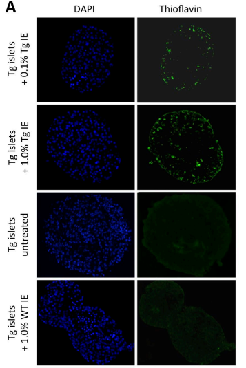 研究人员将这些糖尿病小鼠的胰岛分离出来,接下来他们找了3周龄的转入了hIAPP基因的小鼠,这些年轻小鼠并不存在IAPP的积聚,研究人员同样分离了它们的胰岛,将其与1%或是0.1%的糖尿病小鼠的胰岛提取物共同培养7天。7天后,研究人员发现这些小鼠都出现了IAPP的积聚,而没有加入任何提取物或是加入了普通小鼠胰岛提取物的则没有出现积聚。