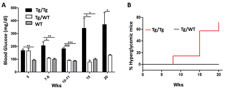 那么小鼠们的“外在表现”又如何呢?研究人员观察到,在第8周开始出现IAPP积聚后,小鼠的空腹血糖水平就开始了“超标之路”,第20周时最高的更是超过了350mg/dl(空腹血糖超过126 mg/dl就可以判断为糖尿病了)。这些小鼠中超过70%都患上了高血糖症(血糖水平>250mg/dl)。在糖耐量试验中,小鼠接受了1g/kg体重剂量的葡萄糖注射。不出意外的,这些小鼠表现也很糟糕,它们的血糖飙升到了未注射时的2.5倍,而在2个小时的时间内也未能恢复到原来的水平,这表明它们的胰岛素分泌确实受到了影响。