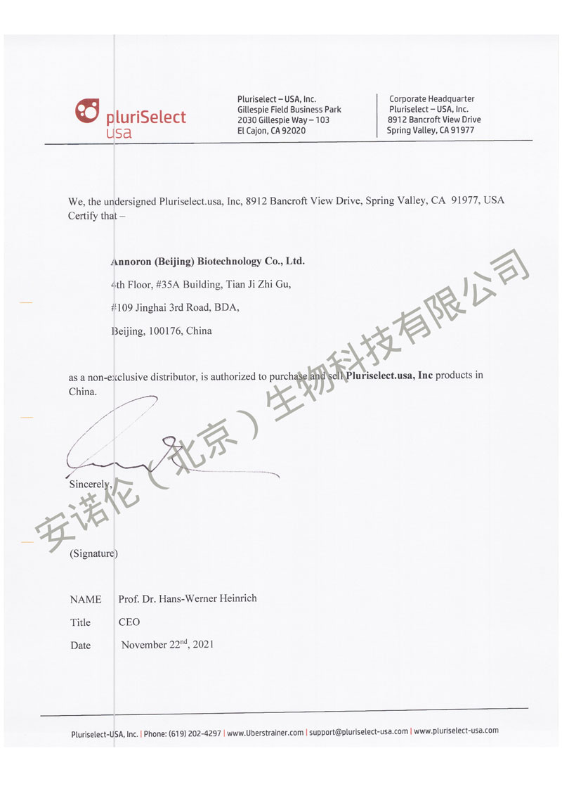 下图为PluriSelect USA代理商安诺伦生物公司的授权书。