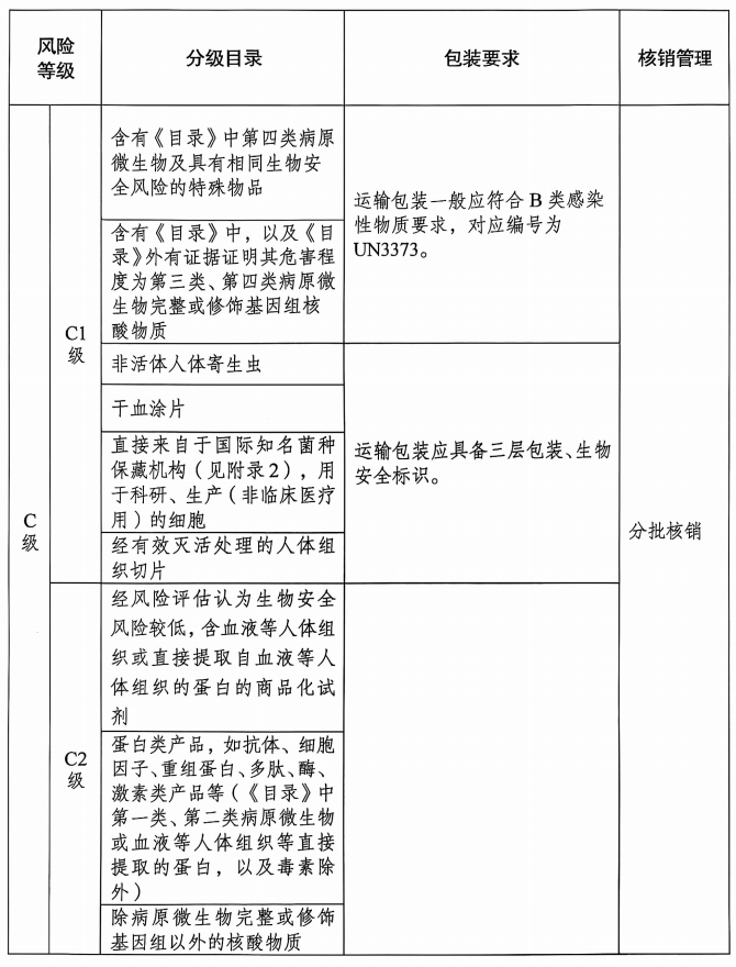二、审批要求方面,审批有效期及核销管理与之前一致(检疫审批方面,A级有效期为3个月、B级为6个月、C级为12个月;核销管理方面,A级需要一次性核销,B、C级可分批核销)。但在新版监管表检疫审批中,强调了不同风险等级特殊物品的运输包装要求。